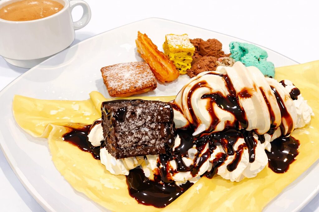 また、このチェーンはスイーツが強いことでも知られています。チーズケーキ、ショートケーキ、プリン、ガトーショコラ、チューロス、クレープ、パンナコッタ、ジェラートなどがそろい、“食事よりスイーツ目当てで満足できる”レベルの充実度があります。小ぶりサイズでいろいろ試しやすいのも人気の理由です。